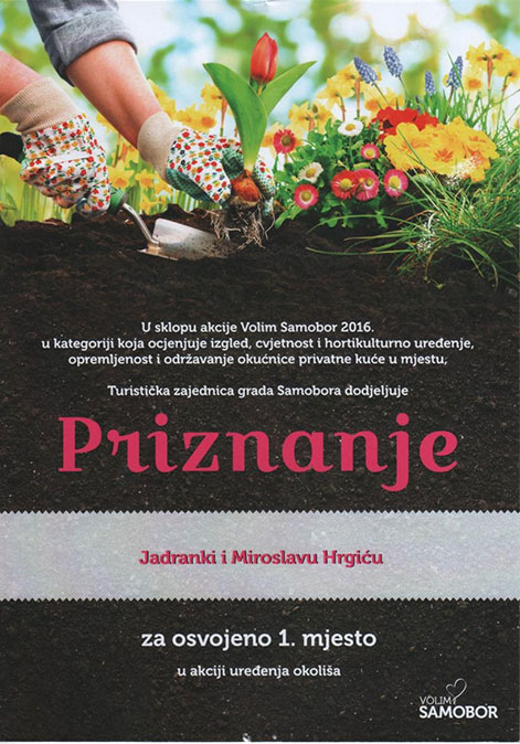 Najljepšu okućnicu u gradu Samoboru imaju supružnici Jadranka i Miroslav Hrgić. Oni su pobjednici natječaja kojeg je u sklopu akcije “Volim Samobor” osmu godinu za redom raspisala Turistička zajednica.