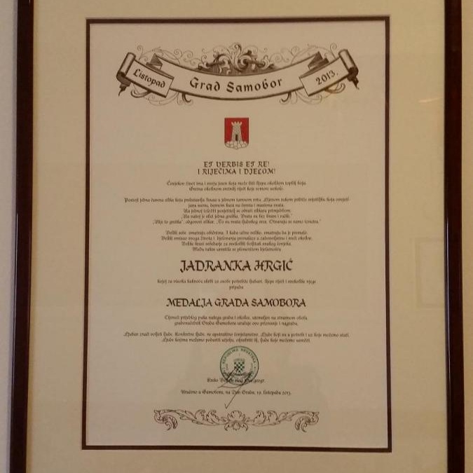 Vlasnica doma, gđa Jadranka Hrgić, nagrađena je na svečanoj sjednici Gradskog vijeća medaljom grada Samobora 19.10.2013.